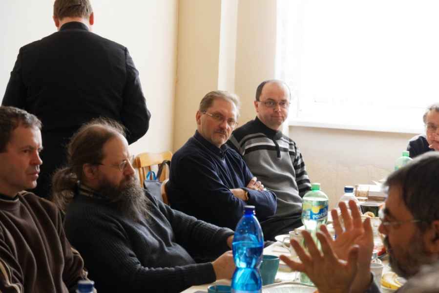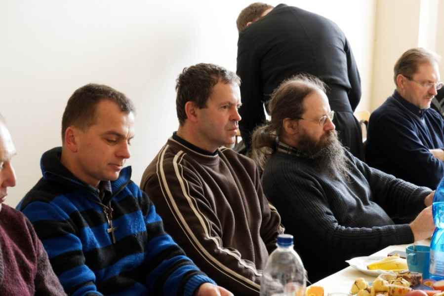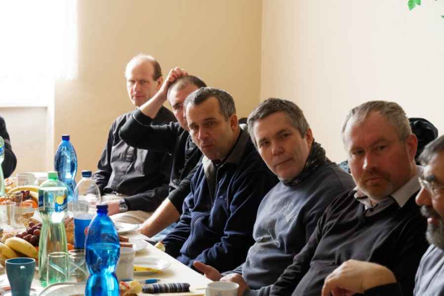 Po mši svaté se kněží shromáždili ke společnému jednání v malém sále v klášteře redemptoristů. O pohoštění se postarali místní farníci - ať už to byly chlebíčky, zákusky, víno nebo další pamlsky od výmyslu světa.