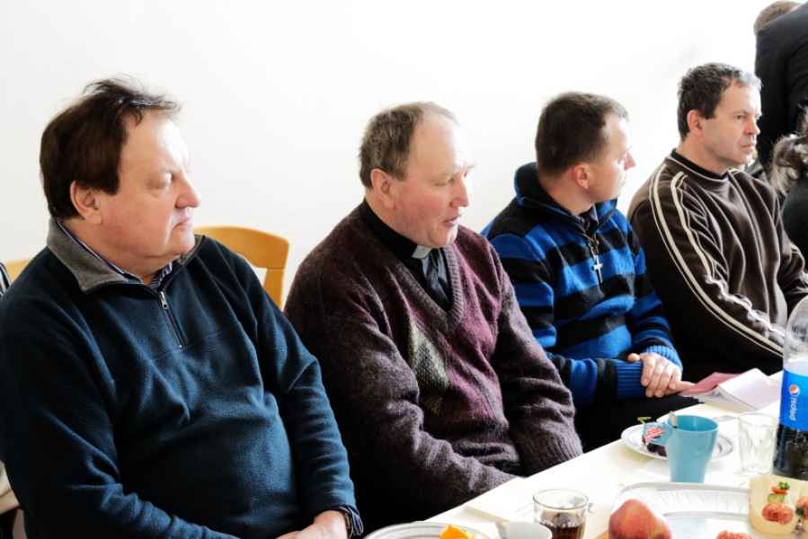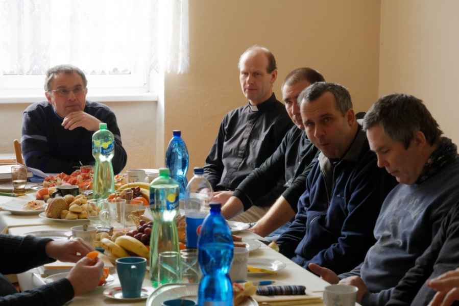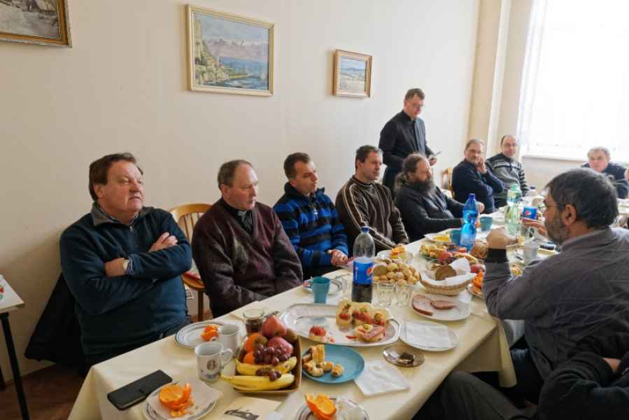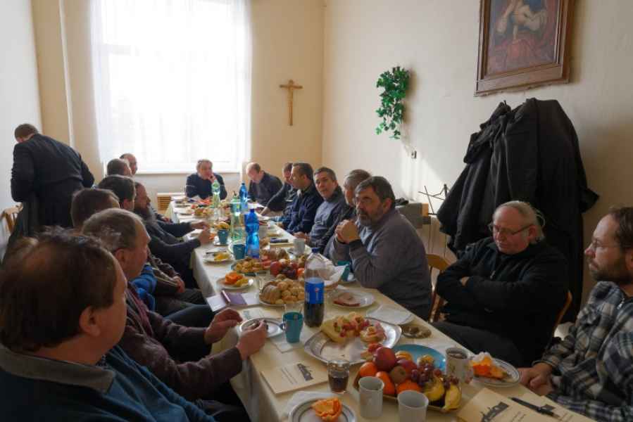 Po mši svaté se kněží shromáždili ke společnému jednání v malém sále v klášteře redemptoristů. O pohoštění se postarali místní farníci - ať už to byly chlebíčky, zákusky, víno nebo další pamlsky od výmyslu světa.